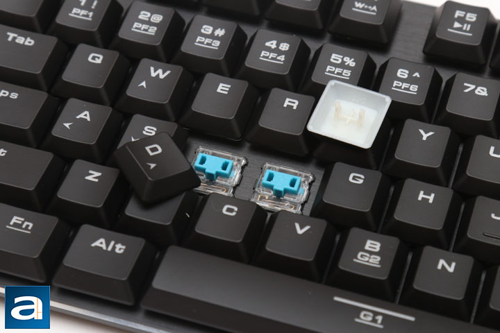 Moving to the secondary functions, you can see there are quite a few in this photo. As with other keyboards, all of these can be accessed by pressing the Fn key prior to executing the desired action. On the top function row, media functions like Previous, Next, Play/Pause, Mute, Volume Up, and Volume Down exist, though they are not all beside each other. On F4, this key allows you to swap the WASD keys with your arrow keys, which is nice to see especially for gaming situations. On the top number row are multiple PF keys, which allow you to switch between different profiles. The Space and B keys are also marked with G1 and G2, respectively, allowing you to make those macro keys to execute recorded options. I probably would still prefer dedicated macro keys, but this is a good compromise while keeping a small footprint.
