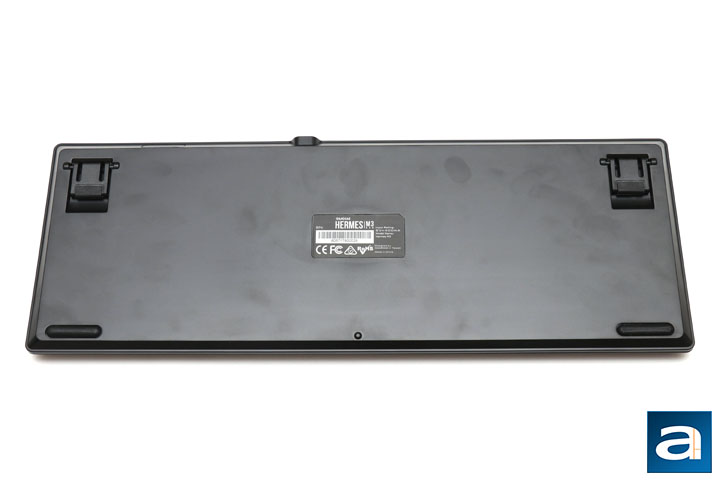 Flipping over the keyboard, you can get a glance at a few things. At the top, there is a cutout for you to connect the micro USB cable. As already mentioned, the cable included is rubber and I would have liked to see a braided cable here, especially when considering the price. At the top two corners are two plastic feet that kick out to prop the Hermes M3 RGB up. They are rubber tipped to prevent the keyboard from moving around too much. There are two more rubber feet at the front of the keyboard to serve the same purpose. Unfortunately, if you actually do not raise the keyboard, the back has no rubber grip to prevent slippage, which can happen. This seems like a bit of an oversight, as not everyone may want to prop their keyboard up.