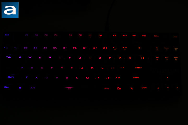 Moving to the lighting department, the GAMDIAS Hermes M3 RGB offers a few nice effects. From its name, you can tell it offers a full spectrum of 16.8M colors. Directly on the keyboard, users can switch between rainbow wave, slide in, fan rotation, and static lights. You can also change the speed of the backlighting here. However, if you go into the software included, you can change not only the color, but also display other effects such as responsive, ripple, and much more. You can also create a static custom mode, making your keyboard light up with different colors at the same time. Most colors are reproduced with pretty good accuracy compared to the user interface in the software too. As for lighting consistency, the keys on the Hermes M3 are not lit evenly. As with other keyboards we have seen, the secondary row of font often is not illuminated as much, which is a shame. GAMDIAS has countered this by putting symbols on the same line as the numbers, but this does not fix all of the keys, especially those with secondary functions.
