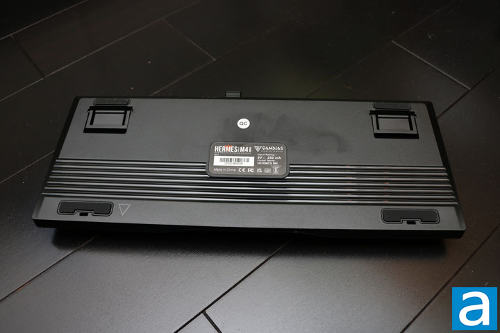 The bottom layout of the GAMDIAS Hermes M4 is fairly standard. Four rubber feet are found in each corner which ensure the keyboard stays in place. The kickstands lift the keyboard to an appropriate angle, and each of them have a small sliver of rubber as well to prevent any unwanted movement. Otherwise, a typical sticker is found in the middle with some extra information.