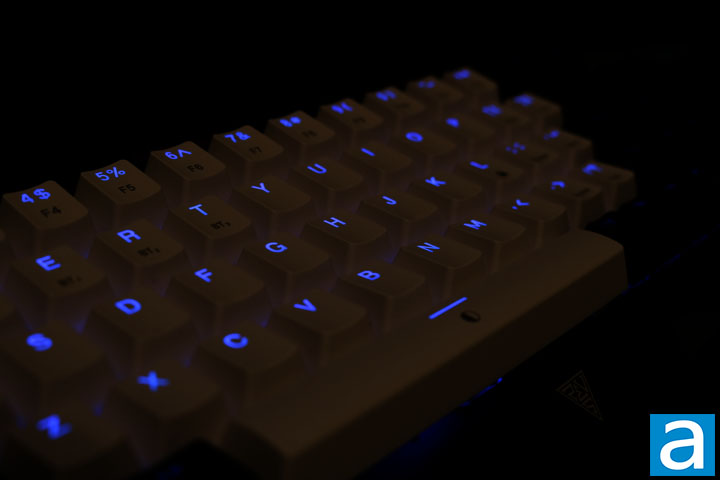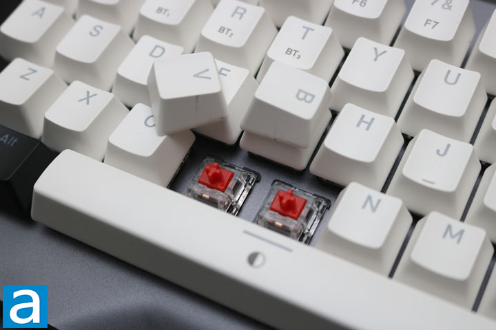 The wider keys, like the Space or Enter key, are stabilized quite well. There is no wire underneath the wire keys, indicating that it uses a Cherry stabilizer. Costar stabilizers have a wire running from one end of the key to the other, making it a bit rattly. On the other hand, a Cherry stabilizer has essentially a mock switch on either side. The key can be pressed anywhere and it will be as if they are pressed in the center. The GAMDIAS Hermes M4 also has N-key rollover, which means the keyboard should register every key that is pressed, no matter how many other keys are pressed. In the picture above, you can see the black marks on the white keycaps left by the included keycap puller. I would recommend using another keycap puller that will not leave a mark on the keys.