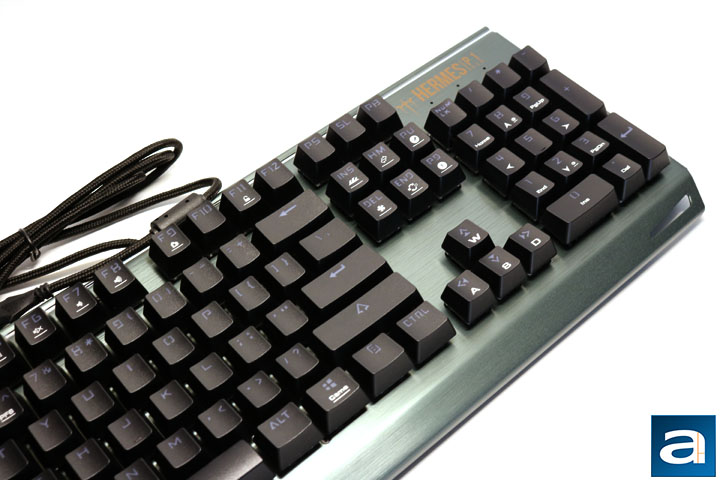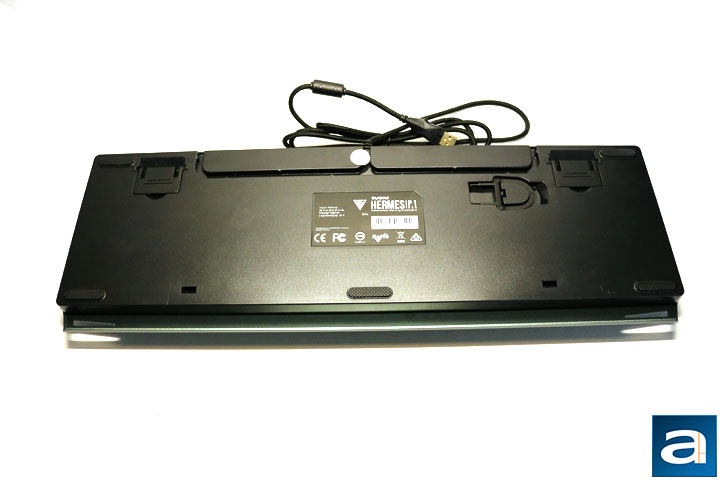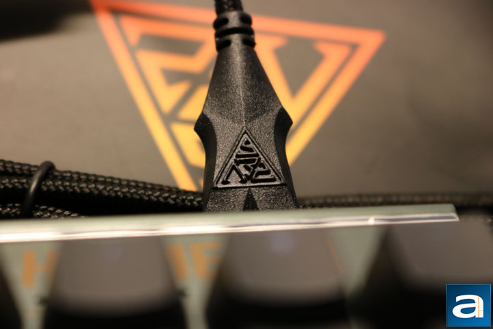 The bottom of the keyboard is fairly standard, except for the keycap puller lodged into the bottom. I find a very helpful addition, as it is an easy instrument to lose when it is not attached or even forget. That said, the aluminum back plate design makes removing the keycaps by hand quite easy. The rest of the back has a sticker in the middle with some information on it, while there are also four rubber feet found at each corner of the keyboard, with one in bottom center as well. These feet do a good job of keeping this heavy keyboard in place. Only the bottom of the two stands have rubber to keep the keyboard in place, so it is recommendable to always have those extended. I found the tracks for the cable the most confusing addition to the back of this keyboard. The cable extends out of the GAMDIAS Hermes P1 RGB in a way that makes it impossible to use the tracks. I find it likely the plastic design on the back is a standard design for more than just the Hermes P1, but also for other GAMDIAS keyboards. This can be troubling as it is an oversight from GAMDIAS; it leads to the conclusion that every keyboard is not individually designed, or it is just a cost saving measure. Regardless, it would be nice to have been able to use the tracks somehow for some extra cable management. Speaking of the cable, it is a braided cable with a gold plated USB connector at the end. The gold does not do anything for connectivity speeds, but it sure does look good when it is not plugged in.