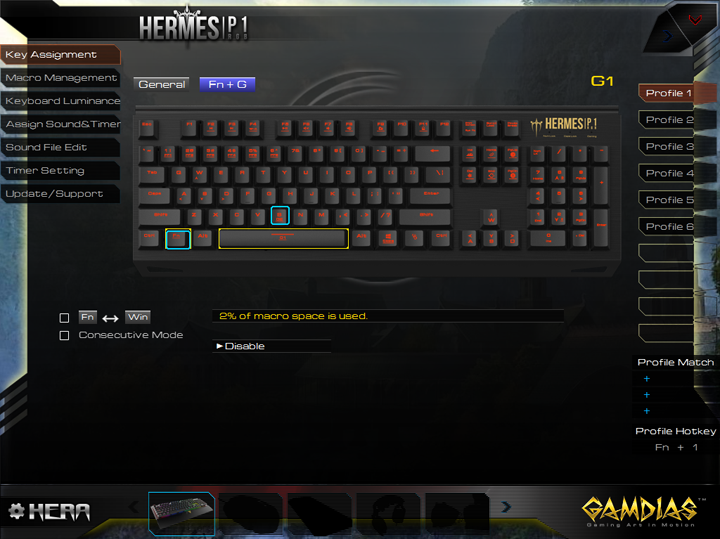 The software was easy enough to find following the instructions in the manual. GAMDIAS uses the Hera software to drive quite a few of their other products like the GKC1001 and Hephaestus Almighty, making controlling multiple products easier. However, using the software was not the best experience, even if everything was set out clearly. The first tab, Key Assignment, allows you to change the keys to perform different functions. You can make any key be something like media functions, shut down your computer, or even launch an application. On this tab, you can also change the current profile. The Macro Management tab is for recording and editing macros. Keyboard Luminance allows you to change everything about the backlight, from increasing the speed of an effect to making each key a different color. Next is assigning timers and sounds to individual keys. After editing or creating sounds or timers in the other two tabs, you can assign those timers and sounds to the rest of the keyboard. The sounds can either happen as the key is pressed, or when the timer finishes. This is a very useful function for anyone who enjoy playing games like World of Warcraft, where there are many different abilities to keep track of. The last tab is where all the software version information is found. What made the software frustrating to use was how it would freeze for a few seconds when switching between the different tabs. It was not as user-friendly as I thought it should be, since some functions were hard to figure out. In some rare occasions, the software would just freeze altogether, and I would have to force close it. There are some spelling mistakes on a few screens too. Overall, the software was functional, but still requires a substantial amount of work to smooth out the edges.