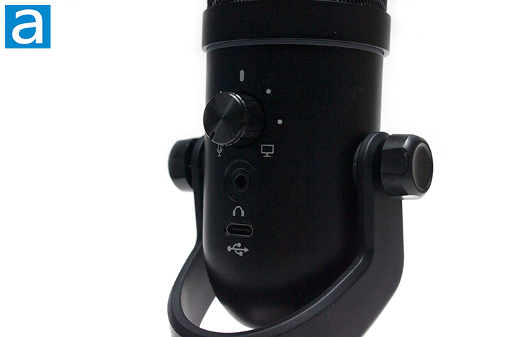 On the back of the GAMDIAS Pheme M1, we have another knob they call the Streammix dial that adjusts the audio monitoring between your computer and the microphone if you choose to connect headphones to the 3.5mm headphone jack directly below the knob. In my testing, the audio monitoring is pretty functional, but when using ENC, the audio sounds better than it really is. Underneath the headphone jack is a USB Type-C port used to connect to your setup. As for the capsule, the GAMDIAS Pheme M1 is a condenser microphone with a super-cardioid pick up pattern. This records 24-bit audio at a 192kHz maximum sample rate. Inside, we have a 14mm condenser capsule that features a frequency response of 20Hz to 20kHz. We also have a signal-to-noise ratio of 72dB.