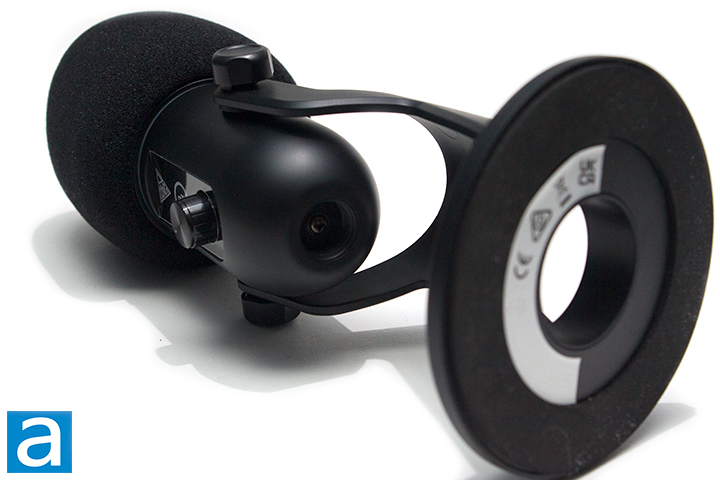 Taking a look at the bottom of the GAMDIAS Pheme M1, you can see the plastic bottom has a ring of foam to dampen vibrations. While the addition is nice, the foam feels a bit stiff, absorbing minimal vibrations and lacks the necessary amount of grip to keep the microphone from sliding on your desk from gentle nudges. This weight seems to be sufficient in keeping the microphone in place when operating the controls. We will see how this foam works out in real-world tests later on. The base is made out of plastic, so it is not the heaviest, but it should be sufficient in keeping the Pheme M1 still in most use cases. If you wish, you can also remove the base and attach it to a third-party mounting arm by using the 5/8” mounting threads on the bottom. Having more metal components in the base would have been nice to add some extra rigidity, but the build quality was sufficient. Otherwise, the microphone’s angle can be adjusted and can even flip upside down to become more compact, given you remove the foam windshield.