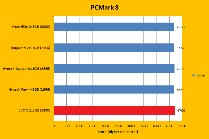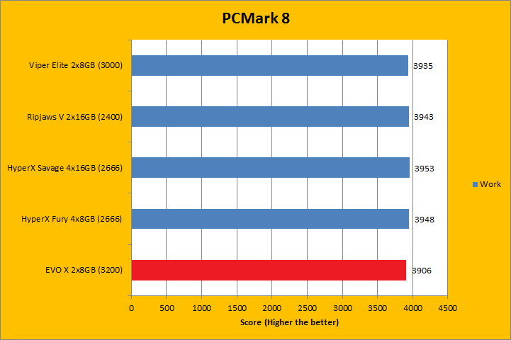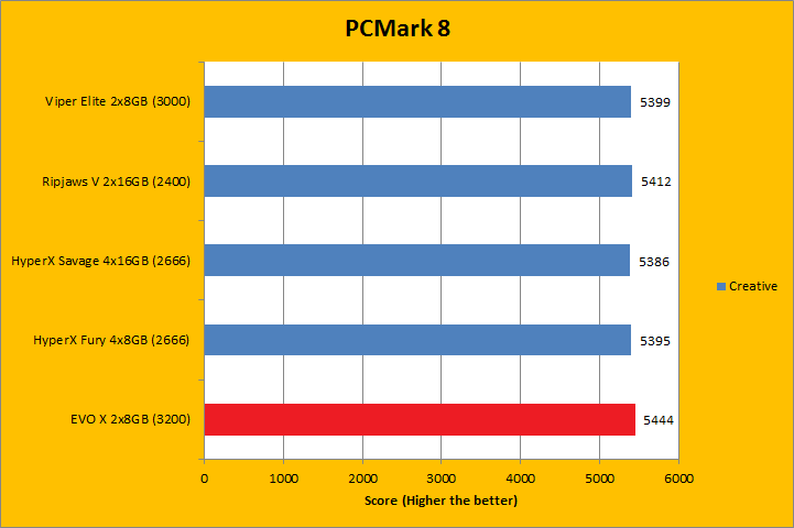 PCMark 8 is the latest revision of the popular full system benchmark from Futuremark. It tests five general categories, which includes Home, Creative, Work, Storage, and Applications. In order to run the Applications benchmark, you must have Adobe Creative Suite and Microsoft Office installed. We do have those programs here at APH Networks, but this is a test platform, so we do not have extra licenses to go around just for benchmarking purposes. As such, I left them out of my results. I did not run the Storage suite, because we are testing a memory kit here. With PCMark 8 fired up, all tests were run in Conventional mode. All tested RAM came out to be extremely close. Even if we were to go by absolute values, there was no clear winner, even if the GeIL EVO X GEX416GB3200C16DC 2x8GB was technically the fastest. Do keep in mind the differences were virtually negligible.