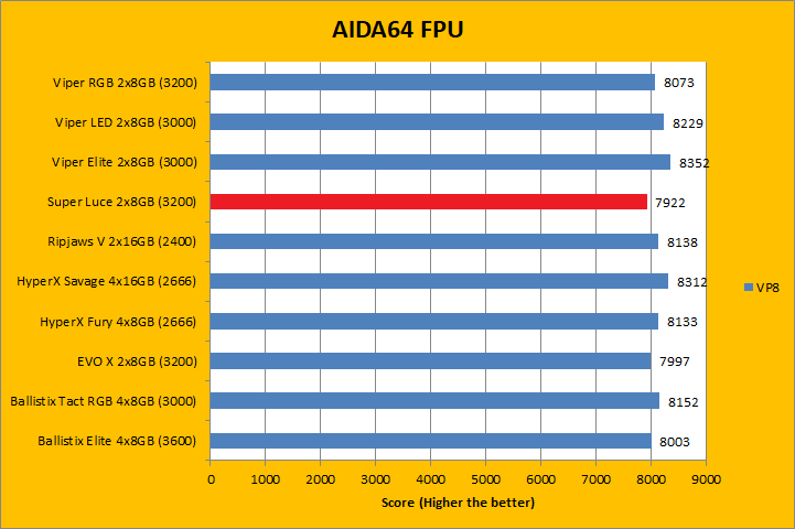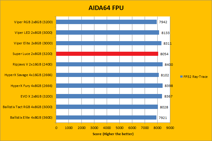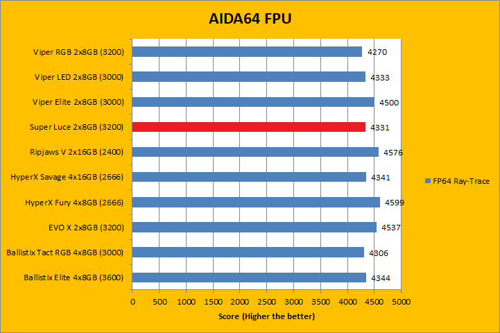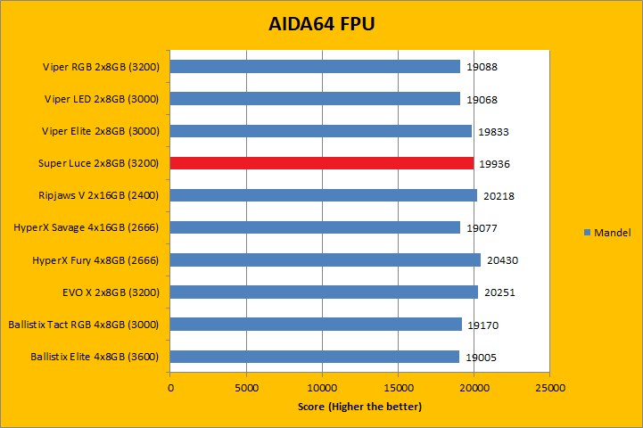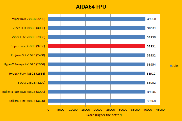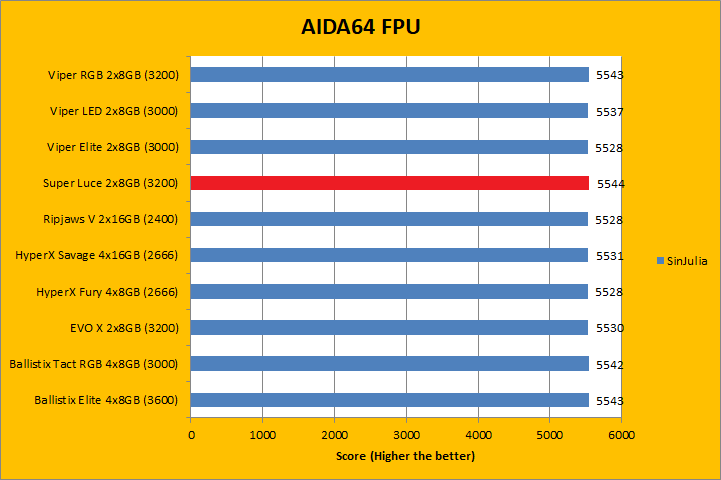 Usually, AIDA64's FPU benchmarks are the least exciting of all when writing a RAM review. This is because the way results are obtained is usually highly dependent on the tested processor; so much to an extent that the outcome is virtually irrelevant to the speed or latencies of the installed memory modules. As you can see in our graphs above, all the results were within a few percent of each other. In the case of GeIL's Super Luce RGB SYNC GLS416GB3200C14DC 2x8GB dual channel kit, it won some and lost some tests. At the end of the day, they were all within the same ballpark as each other.