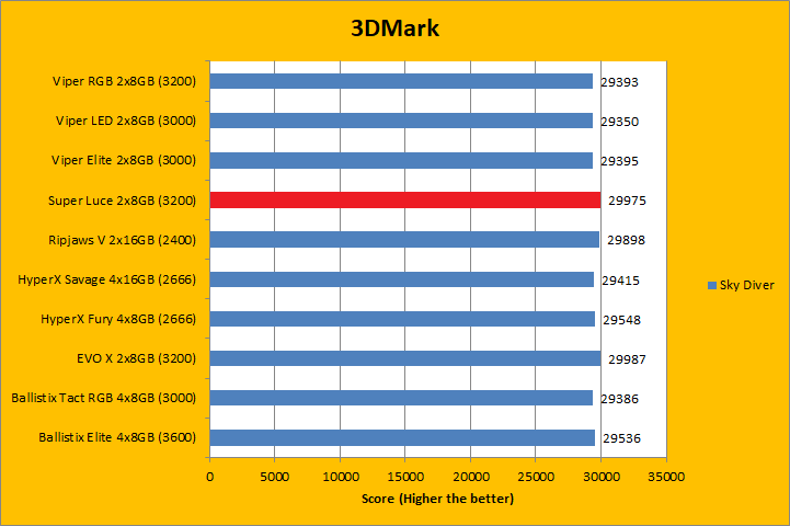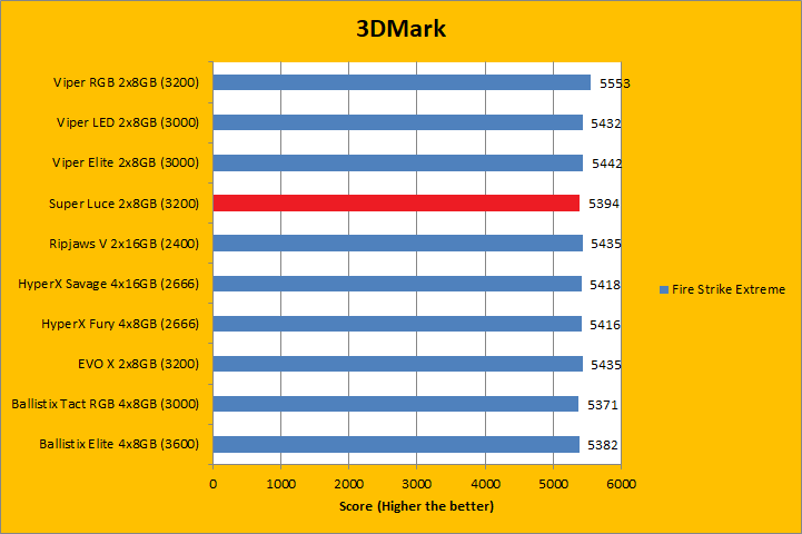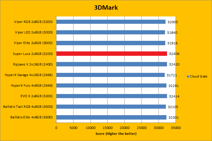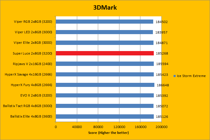 Like UL's PCMark 10 benchmarking suite, 3DMark is yet another favorite among enthusiasts and reviewers alike. In fact, it has been part of the APH Networks' battery of standard benchmarks since the very beginning. The latest iteration of 3DMark is available in a series of presets. We included Fire Strike Extreme, Sky Diver, Cloud Gate, and Ice Storm Extreme; each in decreasing order of GPU dependency for our RAM tests. To give our test platform a little more comprehensive results, I enabled the Extreme option in our tests where possible. As you can see in our graphs above, the DDR4-3200 GeIL Super Luce RGB SYNC GLS416GB3200C14DC 2x8GB remained generally consistent with the pack. Bandwidth played a small role here.
