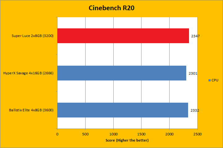 Cinebench R20 is Maxon's latest benchmark to measure CPU rendering performance. The GPU test was dropped by the developers because it has been considered as irrelevant in the benchmarking scene for a while now. Like PCMark 10, since this is a new benchmarking program to us here at APH Networks, we did not retest all the kits we have in inventory, but nonetheless had sufficient data for comparison with our subset of parts. Obviously, having a fast processor will play a significant role in determining these scores, but that does not mean RAM does not do anything at all to contribute to these results. As you can see in our charts above, the GeIL Super Luce RGB SYNC GLS416GB3200C14DC 2x8GB came in first compared to the other two tested kits, which is excellent.