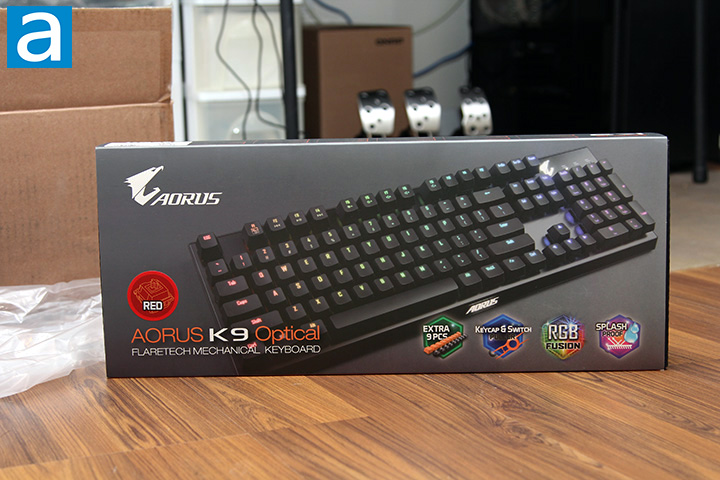 Today's review unit of the Gigabyte AORUS K9 Optical arrived from Gigabyte's offices down in the City of Industry, California. Traveling with FedEx and their quick International 2Day service, this corrugated cardboard box arrived in excellent condition with no real scratches or holes to be concerned about. Inside, Gigabyte has included some packing material to prevent any damage to the contents of the box during shipment.