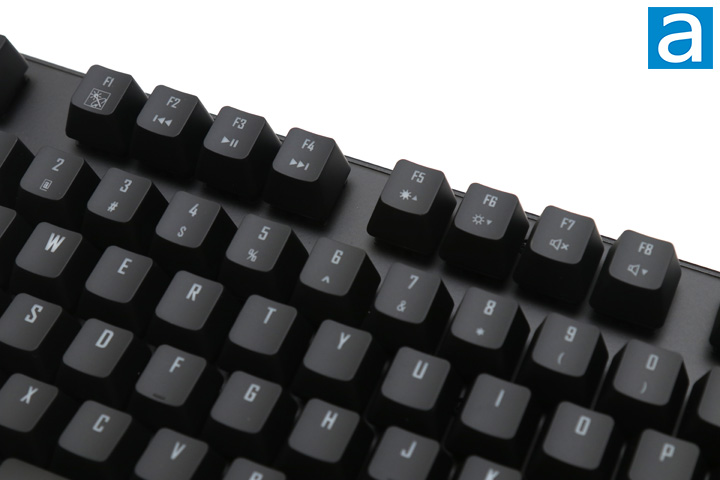 For secondary functions, the Gigabyte AORUS K9 Optical actually has less than I would have expected, but we do still have a standard set of keys. All of these are located on the top Function row and can be activated by pressing the Fn key on the bottom right side before pressing the intended key. Starting from F1, this key is used for changing the lighting controls. F2 to F4 is used for media controls, giving users the Previous, Play/Pause, and Next actions. F5 and F6 are used for controlling the brightness of the backlight. Finally, F7 to F9 lets users control the volume by Mute/Unmute, Volume Down, and Volume Up, respectively. I probably would have liked to see Gigabyte group the lighting controls away from the media and volume controls, but this is not a big deal. Some secondary keys I would have expected include profile switching or backlight effects speed adjustment.
