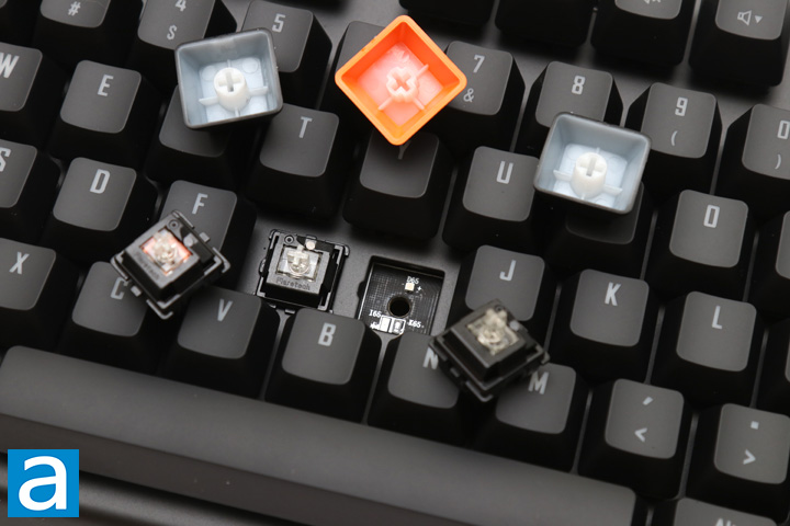 As we indicated in the introduction, the switches on the Gigabyte AORUS K9 Optical utilize mechanical parts, but they are actually triggered utilizing light and a sensor. Similar to previous optical keyboards, a ray of light and a sensor is found in the switch to activate a keypress. There are two main types of optical keyboard switches and they trigger a keypress in different ways. One is known as a Light Strike LK switch, where a horizontal infrared light beams across the switch shaft. When not pressed, the shaft blocks this ray of light. Upon trigger, an opening in the shaft appears that allows the light to cross, activate the sensor, and trigger a keypress. The other type of optical switches are Flaretech. In this case, the infrared light and sensor are both located on the printed circuit board of the keyboard deck. As the switch travels down, the light bounces up into the switch, through a prism, and is reflected back down to the sensor, activating a keypress. This makes the switches cheaper and fully swappable, as there are no electronic parts in the switch itself.