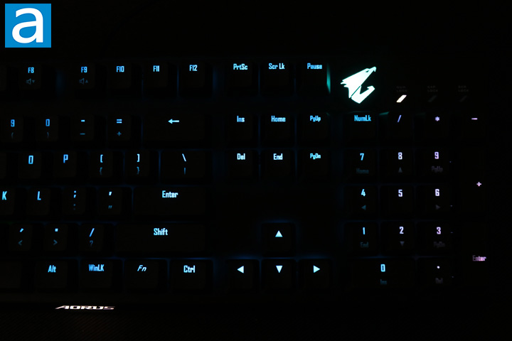 With the lights turned off, the Gigabyte AORUS K9 Optical backlighting shines through, though I think this is one weakness of the keyboard. While they do offer the full 16.7M RGB keyboards with some effects, they are not the brightest and the light placement or keycaps do not help with this. As noted previously, the LEDs are mounted on the circuit board underneath the switch. Thus, after passing through multiple mediums, the LEDs do not seem as bright as compared to other mechanical keyboards. Furthermore, it does not spread evenly through the keycap, as the bottom part of the keycaps are not illuminated. From the photo above, you can barely see the secondary row of writing. In terms of lighting effects, Gigabyte provides a handful of different effects to cycle through, using Fn + F1. We have the rainbow wave, rainbow gradient, static, pulse, rain effect, and reactive ripple. It is not really a whole lot of different effects, though I think it should be fine for the general consumer. As we mentioned previously, you can use Fn + F5 and F6 to increase and decrease the backlight brightness, respectively.