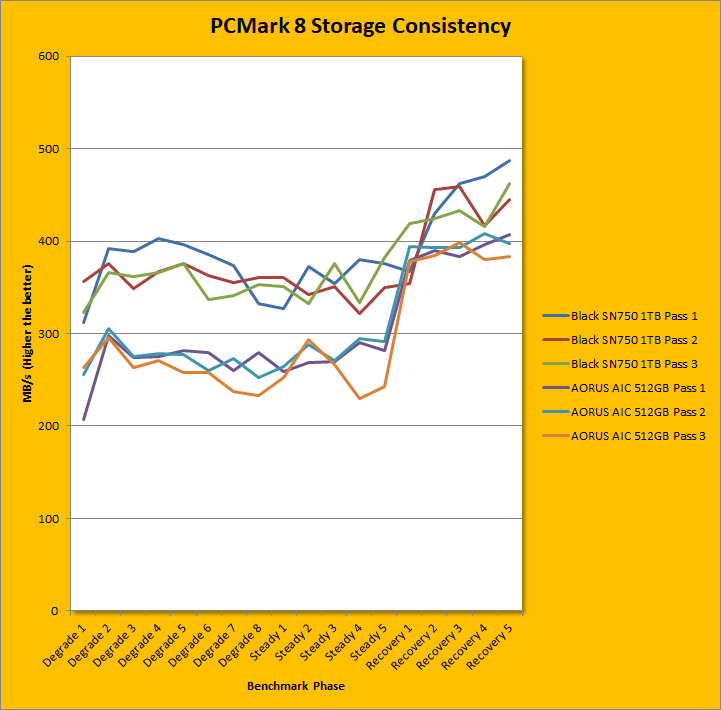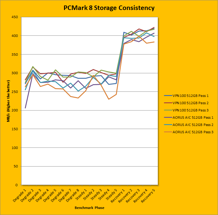 PCMark 8 Storage Consistency Test is one of our favorite benchmarks. Nowadays, many drives are well optimized for high benchmark scores when they are empty, but what separates the professional players from the amateurs is how it stands up to a truly punishing workload. PCMark 8's Storage Consistency Test is designed exactly for this purpose. Going through five phases -- precondition, degradation, steady state, recovery, and clean up -- to extend beyond real world application simulations, this benchmark takes just over two days to complete, but the results are revealing of a SSD's true capabilities. First, I compared it against the SX8200 Pro in the same performance class, where the latter was about 2.33% faster on average. Next, I compared the AORUS RGB AIC against the Viper VPN100, another SSD with nearly identical components, resulting in the Viper VPN100 faster by about 7.80% on average. Lastly, the venerable WD Black SN750 turned out to be about 25.6% faster than the AORUS RGB AIC on average. Overall, the Gigabyte AORUS RGB AIC NVMe SSD 512GB's performance in this benchmark was appropriate for its performance class.
