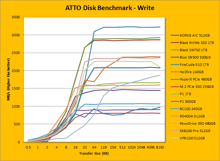 Following up next are our usual ATTO read and write tests. ATTO is an often-quoted benchmark because it is easy to use and accurate. For the most part, it is a favorite among reviewers and I have grown to embrace it as much as the next for the last little while. ATTO uses easily compressible data, so compression-heavy controllers will perform very well here; as far as the Phison E12 controller is concerned -- well, here are our results. As manufacturer peak read and write performance ratings are usually achieved using ATTO, whether a drive lives up to its marketing claims or not can be validated by this program. Gigabyte claims the AORUS RGB AIC NVMe SSD's maximum read and maximum write are pinned at 3480MB/s and 2100MB/s, respectively. The tested results were quite close to the advertised figures. It peaked at 3415.176MB/s read and 2090.008MB/s write. Under the curve, its write speed was consistently behind the Patriot Viper VPN100 512GB and ADATA XPG SX8200 Pro 512GB. In the read test, the Patriot Viper VPN100 512GB and ADATA XPG SX8200 Pro 512GB were both slightly ahead of the AORUS RGB AIC NVMe SSD across the entire range.