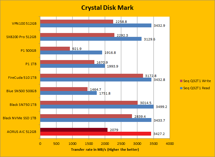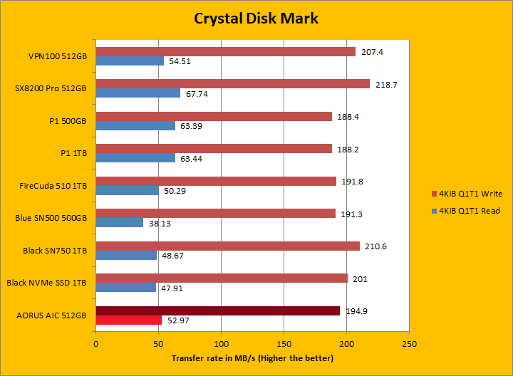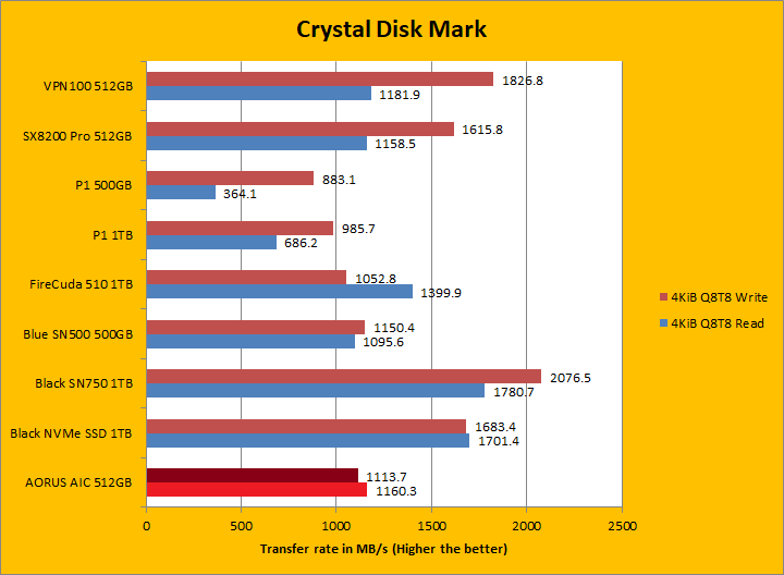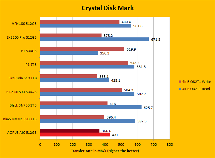 Crystal Disk Mark 6.0 is in the spotlight. Just a bit of background information; higher capacity drives tend to perform a little better in these tests. The ability of a controller and flash memory to deliver high IOPS will provide huge benefits to the score as well. The Gigabyte AORUS RGB AIC NVMe SSD 512GB is rated at up to 360,000 IOPS read and 510,000 IOPS write. Looking at the read and write results of all four sections, the AORUS RGB AIC NVMe SSD 512GB had one of the highest sequential read speed results here at APH Networks. Otherwise, its sequential Q32T1 write and 4KiB Q8T8 read and write was quite a bit behind the SX8200 Pro and Viper VPN100. Its 4KiB Q1T1 read and write came out to be quite comparable against the duo though. I will let you make your own comparisons in our list of SSDs in the graphs above.