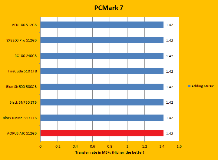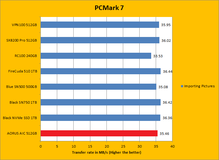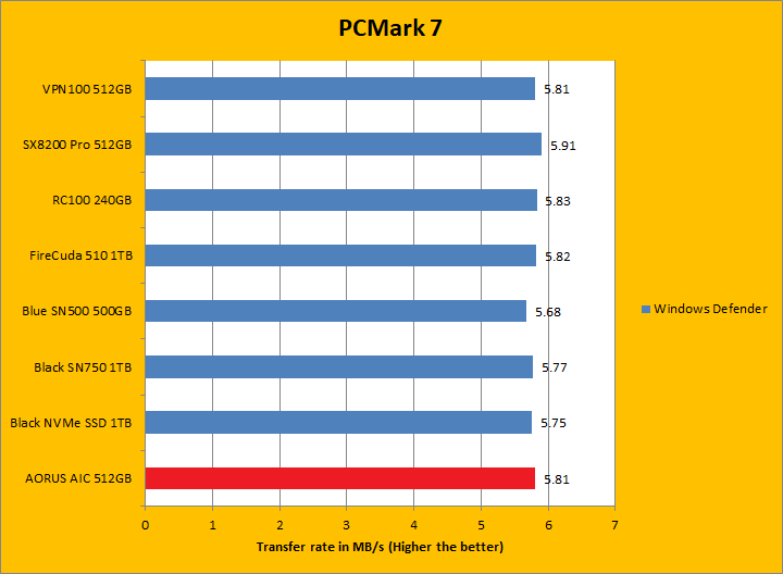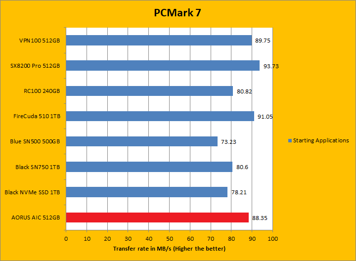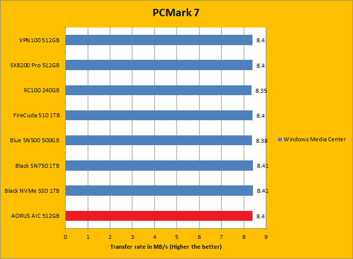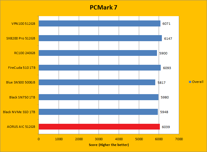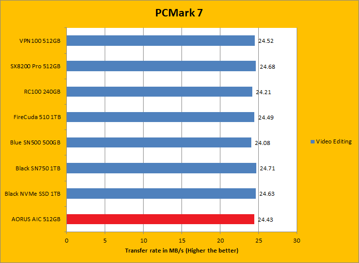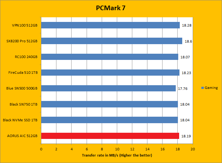 PCMark 7 aims to shed a little more insight into real life performance of your computer hardware by semi-synthetic means -- and all insight is good, right? The great thing about standardized tests is anyone can repeat them and get very similar results, given identical hardware. PCMark 7 is a Windows desktop environment based test, which is exactly what we are after. Well, I am not going to narrate the stuff above in detail, because we all know graphs are there for a very good reason. Just to give you a bit of insight if you are too lazy to go through all eight comparisons, the Gigabyte AORUS RGB AIC NVMe SSD 512GB came in fourth overall; finishing just a hair behind the SX8200 Pro 512GB and VPN100 512GB. In the subcategories, it was generally in the same ballpark as the ADATA and Patriot drives, but consistently crossing the line just behind them by a very small margin. PCMark 7 uses some pretty simple simulations, so it is pretty optimized for drives with relatively fast linear read. The AORUS RGB AIC NVMe SSD 512GB's results were generally excellent.