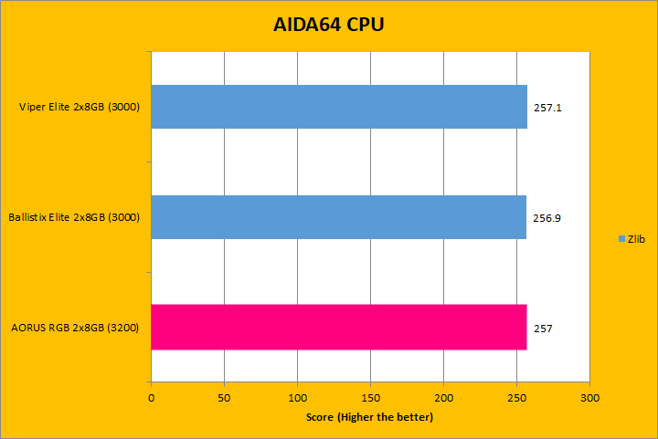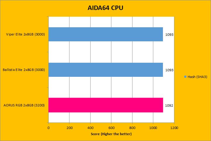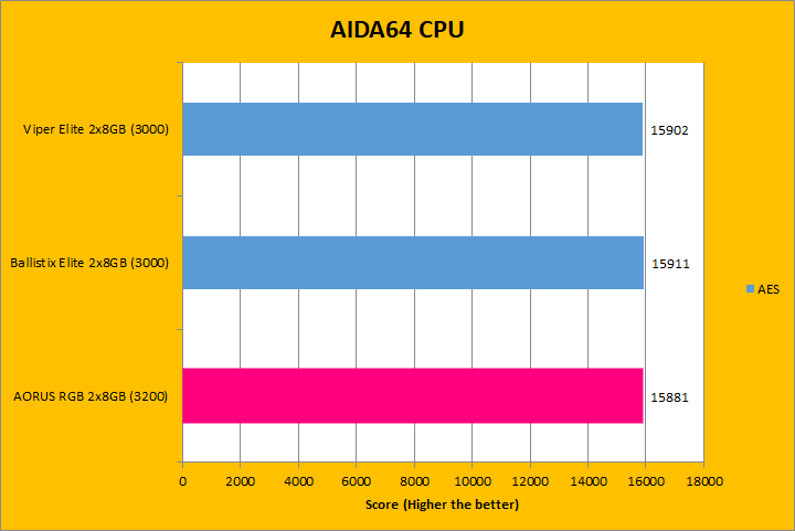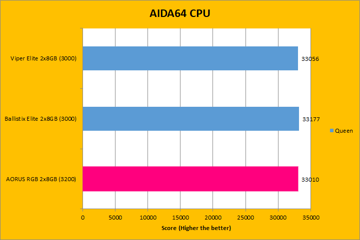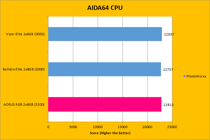 Our first set of benchmark results here are obtained using AIDA64 CPU tests. Version 6.00.5100 (The latest release at press time; which can be downloaded from our Downloads page) were used in this review. It is interesting to see how the numbers compared against some older and newer sets of RAM, because we have a varying combination of speed, capacity, and latencies. As for the performance, you can see they were mostly close to each other. Interestingly enough, even though the Gigabyte AORUS RGB Memory DDR4-3200 2x8GB module operates at a higher frequency and similar latencies, the results were always seemingly the lowest numbers across the three. For example, in the CPU Queen tests, we can see our AORUS unit was the lowest scoring, but all of the numbers differentiated by less than a percent of each other. All of the results were similar across the graphs, which is not too surprising.