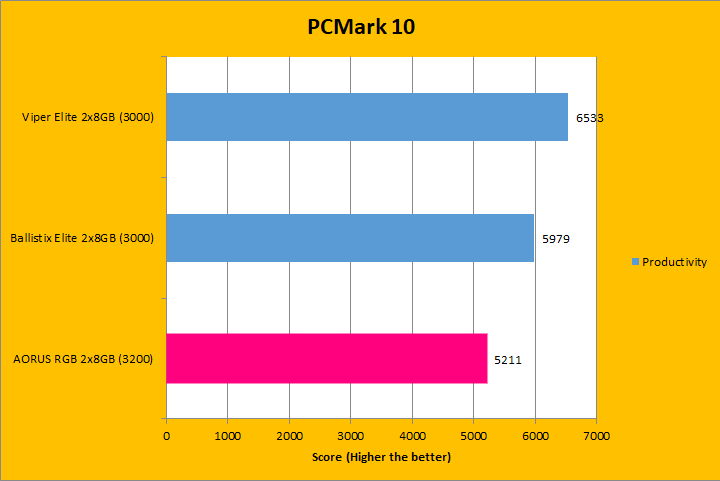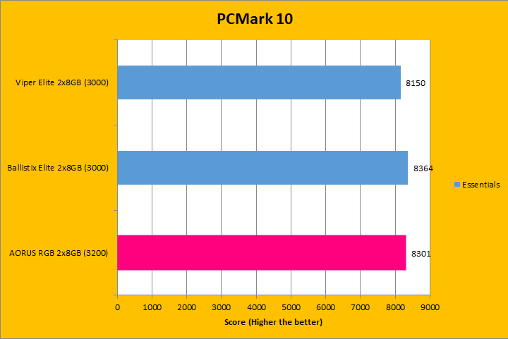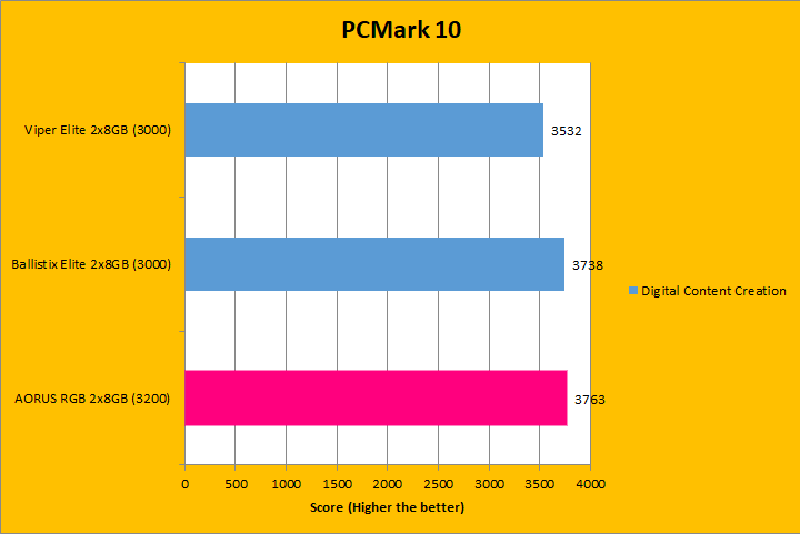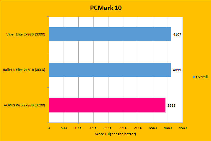 PCMark 10 is the latest version of the popular full system benchmark from UL. A standard benchmark run provides scores in three categories, which includes Essentials, Productivity, and Digital Content Creation. Wrapping up all three categories is an overall score in the end. After the synthetic tests, we can see the PCMark 10 results were more varied. Once again, the Gigabyte AORUS RGB Memory DDR4-3200 2x8GB came in last place overall, staying about five percentage points behind the top Viper Elite 2x8GB DDR4-3000. However, in more details, the AORUS memory kit was mostly second place but came in quite a few points behind in the Productivity tests, which swung the overall score quite a bit lower compared to the rest.