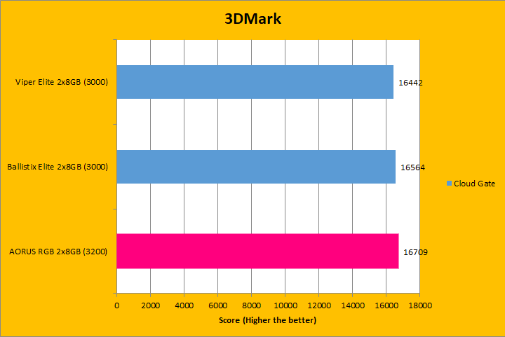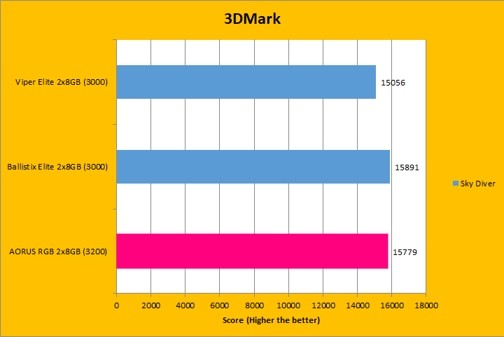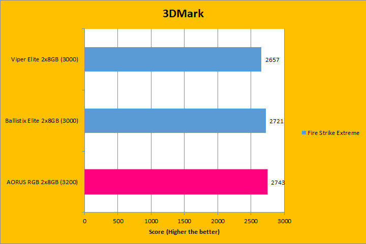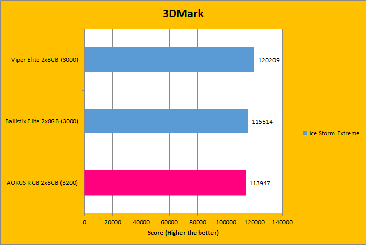Similar to UL's PCMark 10, 3DMark is a favorite among enthusiasts and reviewers. It has been a part of the APH Networks' battery of standard benchmarks since our start. The latest iteration of 3DMark is available in several presets, so we included Fire Strike Extreme, Sky Diver, Cloud Gate, and Ice Storm Extreme; each in decreasing of GPU dependency for our RAM tests. To give our test platform a little more comprehensive results, I enabled the Extreme option in our tests where possible. As you can see in the graphs above, the three tested RAM remained pretty close, with the largest difference only in the Ice Storm Extreme. The Gigabyte AORUS RGB Memory DDR4-3200 2x8GB was ahead of the pack in half of the tests. Bandwidth played a small role in these tests.