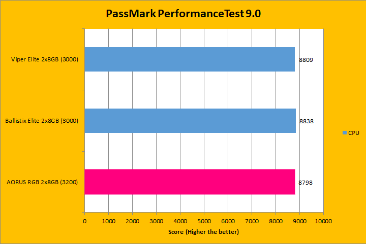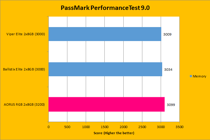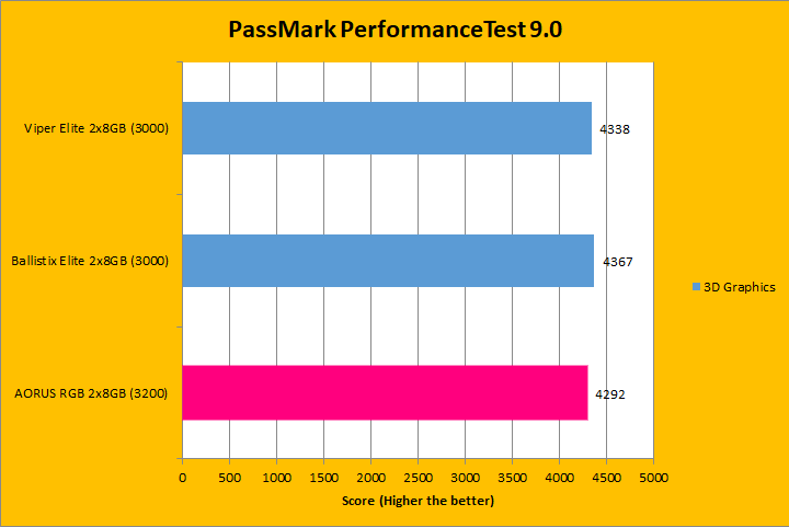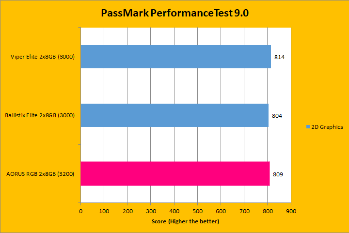 We run PassMark PerformanceTest 9.0 to evaluate four different areas of our system; coming down to the CPU, RAM, 2D Graphics, and 3D Graphics. It takes a somewhat different approach in obtaining results compared to other programs, which is why we like to use it. PassMark Performance Test 9.0's memory benchmarking tool is the only test in our setup that takes memory capacity into account, but all of our units were running with the same 16GB capacity. Like it was in AIDA64, the AORUS RGB Memory DDR4-3200 2x8GB took home the lead in the RAM benchmark. Other than that, most of the results were very close to each other, despite the Gigabyte unit operating at a higher memory clock than the other two tested kits.