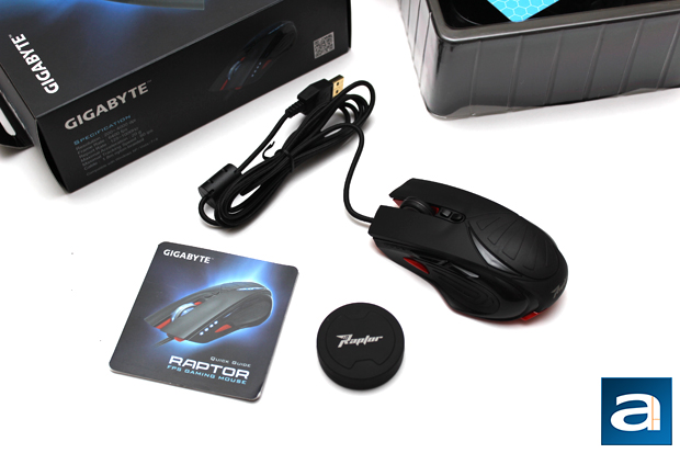 Out of the cardboard box, we are greeted with Gigabyte Force M63's retail packaging. The front is very simple, with the mouse's left side profile as the only image. Gigabyte's logo is up at the top, and the name of the mouse is underneath the picture. Just for your information, while the front panel displays the Raptor name, Gigabyte refers to the mouse as the Force M63. This joins other products in the Force lineup, such as the previously reviewed Gigabyte Force M7 Thor, the Gigabyte Force K7, as well as other peripherals. This was done so customers would not confuse this product with the competition, or more specifically the Corsair Raptor lineup of gaming peripherals. The front panel flips open to reveal a story about how the Raptor got its name. To keep the story short, Raptor comes from the winning design of Gigabyte's "Make it Real Mouse Design Competition". The name serves as an acknowledgement to the original designers and their concept. For consistency's sake, however, I will be referring to the mouse from now on as the Gigabyte Force M63. On the other side of the front flap is a clear plastic shell to reveal the mouse and a small black puck, but more on this later. The side panels reveal some specifications in multiple languages, and the back explains even more features. For your convenience, we have taken this list from the manufacturer's website and posted it below for your perusal: