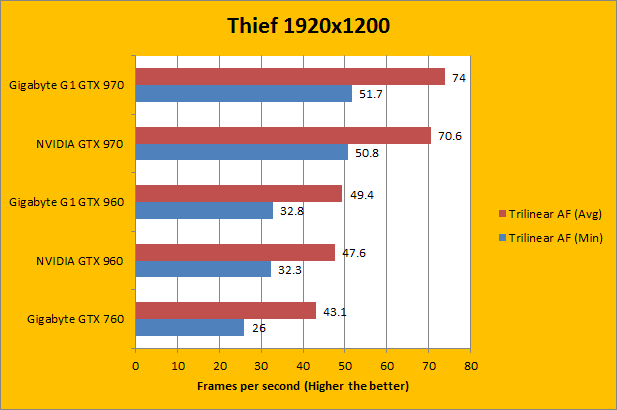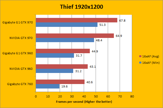 Thief is one of the three changes to our standard graphics benchmarking set here at APH Networks since last year. The Thief series has a pretty long history in the video game world, dating back to 1998. I would not be surprised if the first game is older than some of the readers on this website, haha. The latest release is also the newest game in the set; developed by Eidos Montreal, and published by Square Enix on February 25, 2014. It runs on a modified Unreal Engine 3 with DirectX 11 support. It is reasonably taxing on our hardware, and it also feature a decent in-game benchmarking tool for easy results comparison. Run at 1920x1200 and adjusting only the anisotropic filtering setting, the Gigabyte G1 Gaming GeForce GTX 960 4GB once again delivered results as expected. At maximum settings, it was not exactly the smoothest of all, but the minimum recorded FPS had a decent improvement over the GTX 760 sample we used. The factory overclocked G1 Gaming GTX 960 4GB was about 10-15% faster than the GTX 760 on average, depending on the test. Compared to the NVIDIA specification card, it was about 3-4% faster, which was expected.