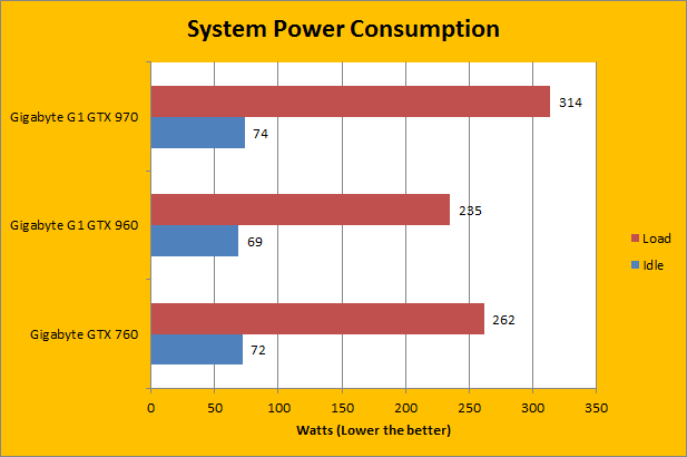 Using a wall power measurement device, I noted down the total system power consumption with the Gigabyte G1 Gaming GeForce GTX 960 4GB installed. Do keep in mind this includes every component of the system -- including power supply efficiency loss -- and not just the graphics card only. With that in mind, the Gigabyte G1 Gaming GeForce GTX 960 4GB's power consumption reached a maximum of 235W load from 69W idle -- a difference of 166W. It was a noticeable improvement over the GTX 760 in both tests; saving the entire computer 3W while idling, and 27W under load.
