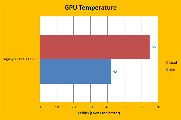 At this point, you may pull up my Gigabyte G1 Gaming GeForce GTX 970 4GB and wonder why these numbers are so much higher than its higher performance counterpart with the same cooler. There are several reasons for this; hence I did not compare the results on the same chart. Firstly, testing my PC upstairs will have some variance in room temperature, which will contribute to one or two degrees of difference. Obviously, this is not the biggest factor, which brings us to the second point. The G1 Gaming GeForce GTX 960 4GB is highly optimized for silence. While idling, the fans are completely stopped, so the graphics card is actually passively cooled. When it is under load, the ramp up is fairly slow for the fans, so it is more tolerant to higher temperatures at the expense of reduced sound emission. They are all well within the designed thermal envelope, and being a quiet PC enthusiast and all, I this this is the way it should be.