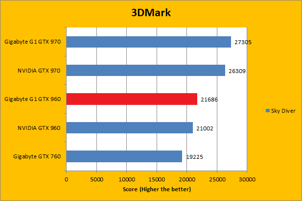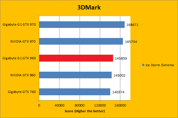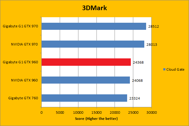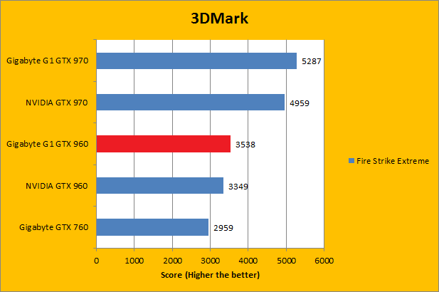 As you can see in our graphs above, the Gigabyte G1 Gaming GeForce GTX 960 4GB is faster than the factory overclocked Gigabyte GTX 760 of the last generation. In the Fire Strike Extreme test, it represented a 20% increase in score. The gap was not as large as we move down the charts, but nonetheless represented a performance improvement. Our slightly overclocked G1 Gaming GTX 960 also managed to score slightly higher than the GTX 960 is stock configuration; delivering a bump up of 5.6%, 3.3%, 1.2%, and 2.0% for Fire Strike Extreme, Sky Diver, Cloud Gate, and Ice Storm Extreme, respectively. These tests are in presented in decreasing order of GPU dependency, which are reflected in the results above.