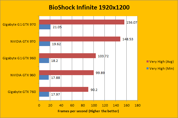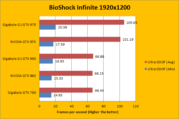 BioShock Infinite is a first person shooter developed by Irrational Games, and published by 2K Games on March 26, 2013. The latest iteration of the BioShock series is based off the Unreal Engine 3, and comes with an excellent command prompt based benchmarking tool out of the box. The Ultra DDOF setting is a DirectX 11 benchmark. However, while when set at Very High, BioShock Infinite reverts to being a DirectX 10 game, so the results are not directly comparable. As you can see in our graphs above, as expected, the Gigabyte G1 Gaming GeForce GTX 960 4GB delivered generally good performance. The average frame rate is very high regardless of setting. However, the minimum does dip pretty low in a couple of scenes, as you can see in our charts above. I have rerun the tests multiple times to ensure this is not a one time lag spike event, but each and every time, the numbers came out to be pretty consistent. As such, they were made official. The factory overclocked card did not make a huge difference in this game compared to a generic card. Actually, it ended up with a statistical tie against the Gigabyte GTX 760 in the Ultra DDOF benchmark. The more performance oriented GTX 970 was considerably faster than the mainstream cards.