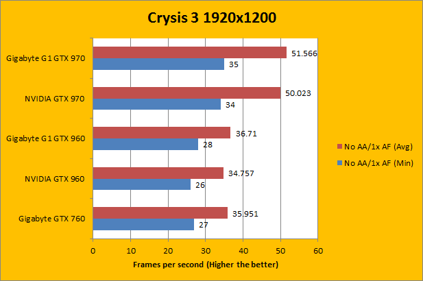 Crysis 3, as its name suggests, is the third installment in the Crysis game series. Based on the CryEngine 3 game engine, it was released on February 19, 2013. This is a DirectX 11 game utilizes some of the latest features of CryEngine 3, such as improved shadows and lighting, vegetation and fog effects, as well as dynamic mapping. Just like the original Crysis, Crysis 3 is particularly tough on PC hardware, especially when you want to have all the effects enabled. With everything maxed out at 1920x1200 and adjusting only AA and AF, the trio of mainstream cards did have a bit of trouble keeping up, whereas the GTX 970 did just fine. Overclocking the GPU and VRAM does not do a whole lot in this game; both the Gigabyte G1 Gaming GeForce GTX 960 4GB and G1 Gaming GeForce GTX 970 4GB had marginal improvements over its stock configured counterparts. Interestingly, the GTX 960 delivered almost identical performance as the GTX 760.