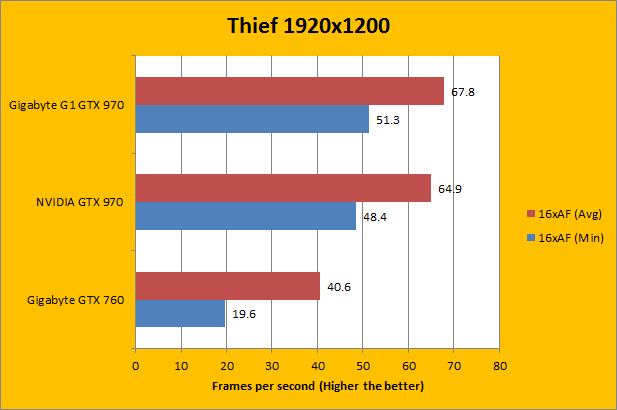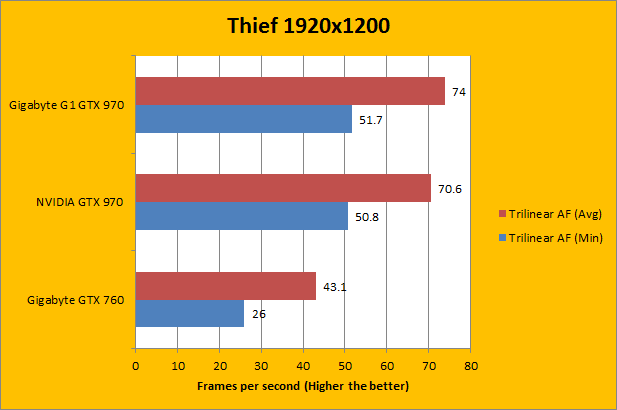 Thief is one of the three changes to our standard graphics benchmarking set here at APH Networks since last year. The Thief series has a pretty long history in the video game world, dating back to 1998. I would not be surprised if the first game is older than some of the readers on this website, haha. The latest release is also the newest game in the set; developed by Eidos Montreal, and published by Square Enix on February 25, 2014. It runs on a modified Unreal Engine 3 with DirectX 11 support. It is reasonably taxing on our hardware, and it also feature a decent in-game benchmarking tool for easy results comparison. Run at 1920x1200 and adjusting only the anisotropic filtering setting, the Gigabyte G1 Gaming GeForce GTX 970 4GB once again delivered very good results. At maximum settings, it is not exactly the smoothest of all, but it shows how much processing power it offers compared to the last generation midrange card. Our factory overclocked unit from Gigabyte also managed to produce an improved score of 5.5% and 6% for each respective configuration runs compared to NVIDIA specifications.