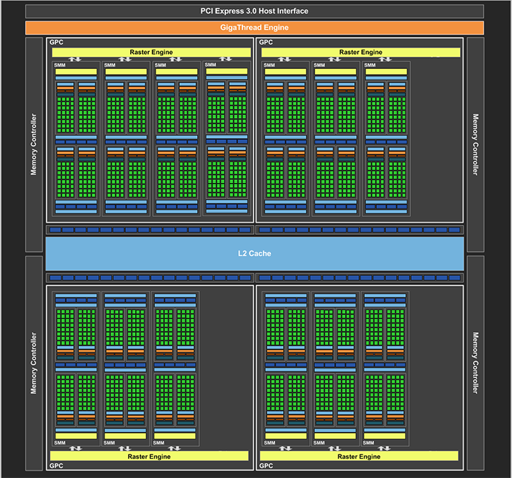 Specification speaking, only thirteen streaming multiprocessors (SMM) are enabled, whereas the GTX 980 has sixteen. Each SMM has four partitioned blocks inside, as shown in our diagram above; with 128 CUDA cores, eight texture units, 32 load/store units, and one PolyMorph engine. Each SMM has 48KB of L1 cache. As such, the NVIDIA GeForce GTX 970 features 1664 CUDA cores and 104 texture units in aggregate. The company left the memory and raster operations untouched compared to the GTX 980, so it retains 64 ROPs and a full 256-bit memory interface. At 224GB/s, this is not a lot of memory bandwidth for a performance card, but it features a large 2MB shared L2 cache, which promises to reduce memory bandwidth usage by about 25%. The GTX 970 built on the TSMC 28nm fabrication process, with a transistor count of 5.2 billion.