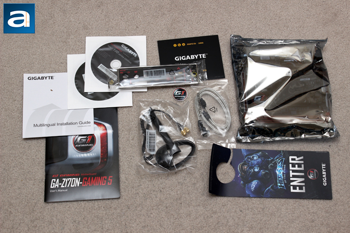 Out of the box, you can see most of the standard things here. In addition to the GA-Z170N-Gaming 5 motherboard itself, we have two silver SATA cables (One angled and one straight), a rear black and red I/O shield, and an antenna for the included WiFi and Bluetooth. The antenna has a magnetic base, so it is capable of sticking on the side of your case for better mounting. As for documentation, we have two manuals and two CDs for utilities. Otherwise, we have a Heroes of the Storm door hanger, and a Gigabyte G1 sticker showing the "gaming" side of the motherboard. I think I would have liked one or two more SATA cables, but otherwise, everything included is what is necessary.