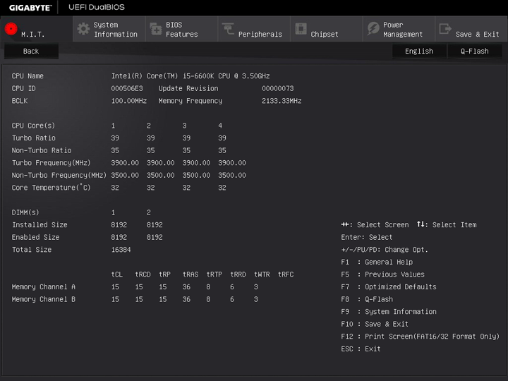The M.I.T. Current Status screen provides even more detailed information, which will again help with overclocking. Here you can find information like CPU name, CPUID, CPU update revision, Turbo/Non-Turbo multiplier, and frequency of each core, temperature of each core, memory size in each DIMM, as well as current latency settings for each channel of memory. Gigabyte does an excellent job in providing information in an easy-to-read layout.