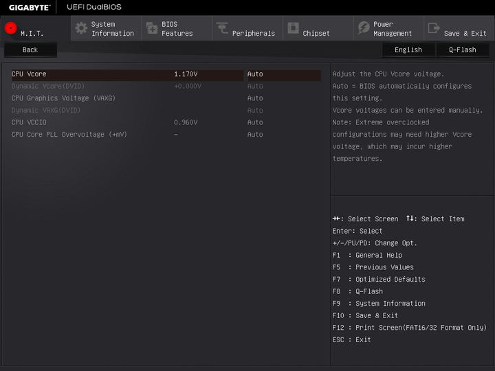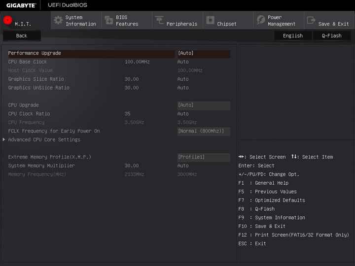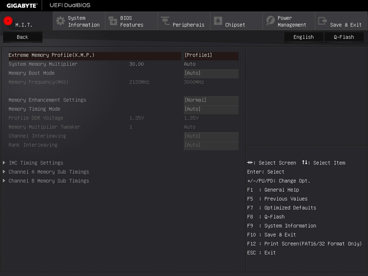 If you have used Gigabyte motherboards in the past, you will probably be familiar with the Motherboard Intelligent Tweaker, as shown above. This divides into six more sections: M.I.T. Current status, Advanced Frequency Settings, Advanced Memory Settings, Advanced Voltage Settings, PC Health Status, and Miscellaneous Settings, respectively. It should be clear based on the name what each section includes, but I will dive deeper into each page as we move forward. At the bottom section of the M.I.T screen, the BIOS version, BCLK frequency, CPU frequency, memory frequency, total memory capacity, CPU surface temperature, and Vcore are displayed right here. This is very handy layout choice, especially when I had to overclock the computer. I should note the somewhat higher idle CPU temperatures, but this is because I was using an Intel stock cooler during the screenshots, thus the temperatures are a tad higher than most other CPU coolers.