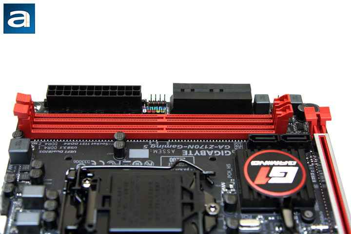 The ATX 8-pin power connector is located near the top left corner of the motherboard, near the standard mounting screw location. This should allow for more power to be delivered to the motherboard, especially during overclocking. It is somewhat cramped in this area, but thankfully it is near the edge of the board, thus leaving sufficient room for people to attach the cable to the motherboard. A debug header is near the right side of the power connector, but this is rarely used by consumers. Otherwise, unless you have a gigantic CPU cooler sitting on the processor, I doubt you will have issues getting to this area.