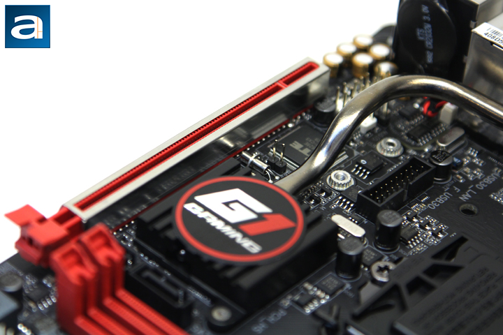 If you have read our review on the Gigabyte GA-Z170N-WIFI, you will see the Gaming 5 model is not too different. However, the main difference comes from the not-so-subtle red and black theme, as compared to the all-black finish on the Z170N-WIFI. With a flat black soldermask on a lot of their motherboards for quite a while now, Gigabyte moved away from their older royal blue colors. The secondary colors have varied between generations, but the recent Z97 and now Z170 gaming model motherboards have been utilizing these colors. Red and black is a pretty typical combination, and while the motherboard may not necessarily be the resplendent centerpiece of every build, this color palette is quite noticeable. Otherwise, the rest of the motherboard is in a shade of gray or silver for the metal components. For reference, the photo above is rotated on its side, because the rotated "G1 Gaming" logo is placed as seen. Maybe it is my own obsessive compulsive feelings, but I think Gigabyte should fix this. The sideways letters of "Gigabyte" and the model name is not as offensive, as they are just a few rows of words, and not an entire logo. As it has gained popularity, the GA-Z170N-Gaming 5, like all Gigabyte midrange motherboards and higher, features Japanese ultra-low ESR solid state capacitors guaranteed for maximum performance for 10,000 hours. There are also ferrite core chokes and lower RDS(on) MOSFETs for maximum durability and energy efficiency.