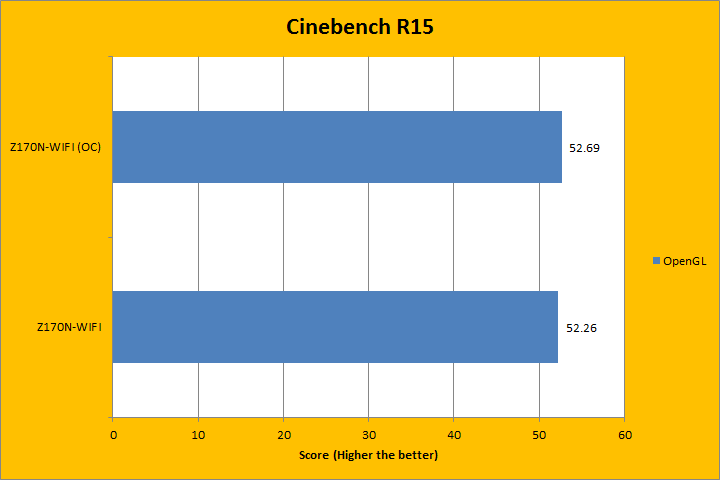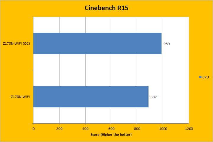 Cinebench R15 is separated into two tests: One tests the CPU image rendering performance, while the other benchmarks the OpenGL video rendering performance. Obviously, having a fast processor and a powerful graphics adapter, respectively, will play a much more significant role in determining these scores, so I was quite interested in what the overclocked Intel Core i7-6700K could do on the Gigabyte GA-Z170N-WIFI. In the OpenGL test, we gained less than 1 FPS, which was not significant. However, the CPU test provided a more noticeable increase. At stock, it came in at 887, but overclocked, we saw a modest but decent 11.5% kick up from stock configuration to 989.