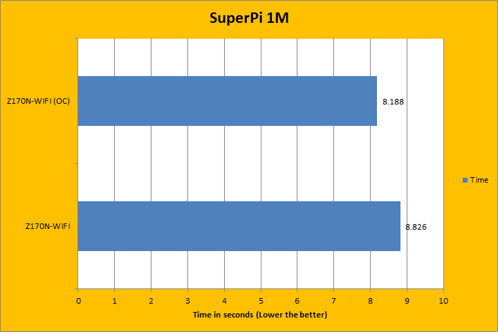 We have always included SuperPi in our benchmark results, because it is a quick and dirty run that always proves to be interesting. It is neither the fastest way to calculate Pi, nor is it the most challenging. But being an enthusiast at heart, this program has always provided interesting results for showing off your overclocking prowess at your favorite online forum. Any increase in clock speed will indeed make a difference in this test, and with an additional 800MHz from the Core i5-6600K's 3.9GHz Turbo Boost specification, the Gigabyte GA-Z170X-UD5 running the overclocked processor easily shaved off 1.746 seconds off the baseline time.