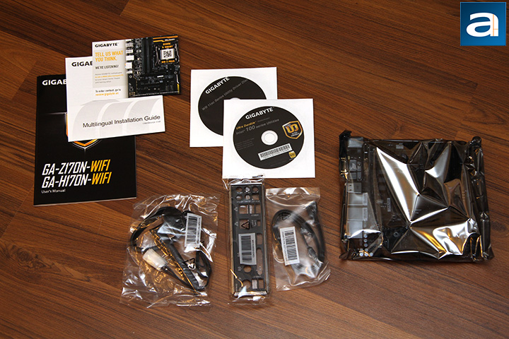 Upon opening the box, a simple bundle accompanies the Gigabyte GA-Z170N-WIFI from the factory. Basically, everything you see in the photo above is everything you will get. Besides the motherboard itself, you will receive two black SATA cables (One angled and one straight), a rear I/O shield, manual, installation guide, two driver/software DVDs, and an antenna for use with its WiFi and Bluetooth module. There certainly is not a whole lot out of the box, but you will get everything you need for the most part.