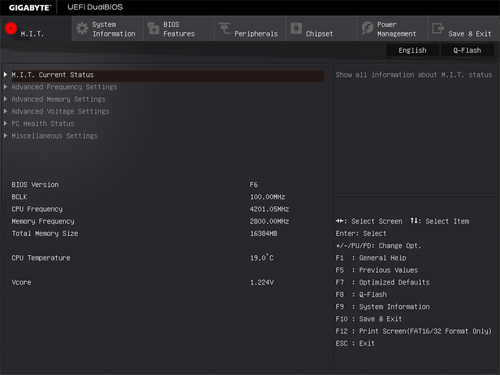 If you have used Gigabyte products in the past, you will be quite familiar with the Motherboard Intelligent Tweaker, as shown in our screenshot above. It further divides into six more sections. These sections are labeled M.I.T Current Status, Advanced Frequency Settings, Advanced Memory Settings, Advanced Voltage Settings, PC Health Status, and Miscellaneous Settings, respectively. It should be generally clear what the kind of settings are listed under each section, but I will go into these sections in detail in just a moment. Furthermore, we can see at the bottom section of the Motherboard Intelligent Tweaker screen the BIOS version, base clock frequency, CPU frequency, memory frequency, total memory size, CPU surface temperature, and Vcore -- right from the start. I found this particularly handy and convenient during my overclocking runs.