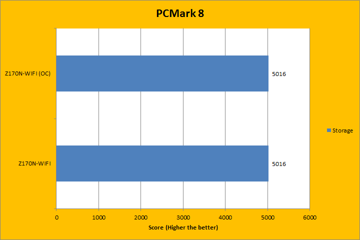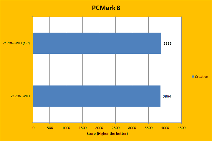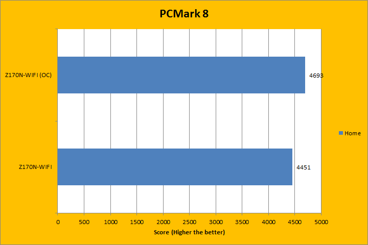 PCMark 8 is the latest revision of the popular full system benchmark from Futuremark. It tests five general categories, which includes Home, Creative, Work, Storage, and Applications. In order to run the Applications benchmark, you must have Adobe Creative Suite and Microsoft Office installed. We do have those programs here at APH Networks, but this is a test platform, so we do not have extra licenses to go around just for benchmarking purposes. As such, I left them out of my results. I did run the Storage suit, because we are testing a full motherboard here. With PCMark 8 fired up, all tests were run in Accelerated mode, where available. Much to my surprise, running the Intel Core i7-6700K at 4.5GHz and at stock (Turbo Boost up to 4.2GHz for a single core) on the Gigabyte GA-Z170N-WIFI made no significant difference, if at all, depending on the test. This, again, was probably due to motherboard limitations, which I will discuss on Page 12.