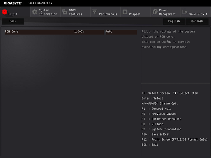 If you have used Gigabyte products in the past, you will be quite familiar with the Motherboard Intelligent Tweaker, as shown in our screenshot above. It further divides into six more sections. These sections are labeled M.I.T Current Status, Advanced Frequency Settings, Advanced Memory Settings, Advanced Voltage Settings, PC Health Status, and Miscellaneous Settings, respectively. It should be generally clear what the kind of settings are listed under each section, but I will go into these sections in detail in just a moment. Furthermore, we can see at the bottom section of the Motherboard Intelligent Tweaker screen the BIOS version, base clock frequency, CPU frequency, memory frequency, total memory size, CPU surface temperature, and Vcore -- right from the start. I found this particularly handy and convenient during my overclocking runs.