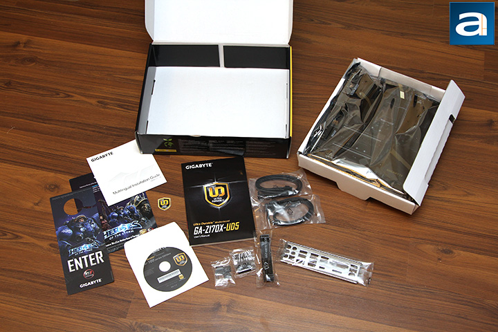 Upon opening the box, a simple bundle accompanies the Gigabyte GA-Z170X-UD5 from the factory. Basically, everything you see in the photo above is everything you will get. Besides the motherboard itself, you will receive four black SATA cables (Two angled and two straight), one SLI bridge, a rear I/O shield, manual, installation guide, driver/software DVD, G Connector, plastic port caps, Heroes of the Storm contest promotion card, and Heroes of the Storm door tag. Well, plus a Gigabyte sticker for what it is worth, haha. You do not get a whole lot out of the box, but for everything that is included, there is substance to it. The G Connector is pretty much the same thing as ASUS' Q Connector back in the days; it helps combine front panel case I/O wires into a single block for simplified management.