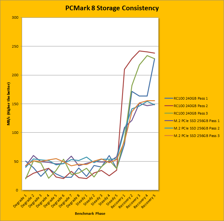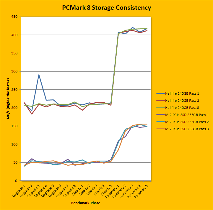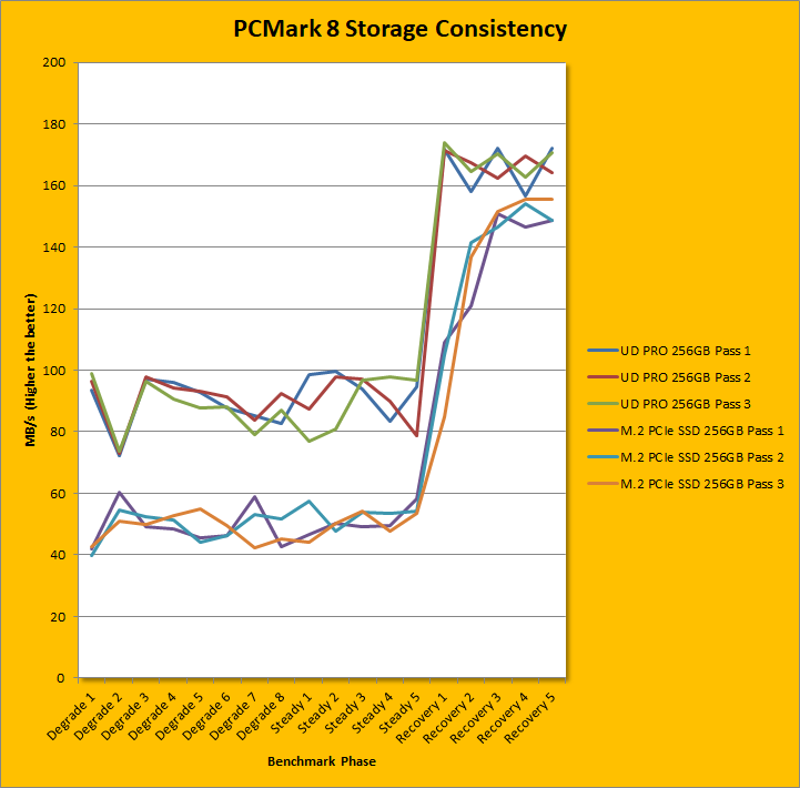 PCMark 8 Storage Consistency Test is one of our favorite benchmarks, but also one of the more taxing ones too. Nowadays, many drives are well optimized for high benchmark scores when they are empty, but what separates the professional players from the amateurs is how it stands up to a truly punishing workload. PCMark 8's Storage Consistency Test is designed exactly for this purpose. Going through five phases -- precondition, degradation, steady state, recovery, and clean up -- to extend beyond real world application simulations, this benchmark takes around two days to complete, but the results are revealing of a SSD's true capabilities. Unfortunately, the Gigabyte M.2 PCIe SSD did not fare well in these tests. If you look at our first graph, which compares the Gigabyte SSD against one of the best recent M.2 drives we have reviewed, the Patriot Hellfire M.2 240GB, and the numbers were not even close. In this case, the Hellfire speeds were 429%, 407%, and 300% of the Gigabyte M.2 PCIe SSD in degradation, steady, and recovery phases respectively. Taking a comparison to the Toshiba RC100 240GB, you can see these numbers were far more comparable, as the Gigabyte was faster than the Toshiba in degradation by 53% and steady by 42%, but slower in recovery by 41%. One common theme between these two drives is the fact both of these drives rely on system memory with its use of host memory buffer or HMB. You can see compared to the UD PRO, which had its own onboard memory, the M.2 PCIe SSD posted noticeably slower numbers, especially in the degradation and steady phases, despite being based on the faster NVMe standard. I will say however, the scores are pretty consistent across each of the phases, which is a positive thing.