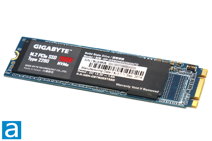 The other major component to take note of are the four NAND flash nearby. It is marked 'KA19G54AOE'. According to the manufacturer, this is either Toshiba BiCS3 or Spectek/Micron B16. Both of these are 64-layer 3D TLC NAND flash chips. Personally, I think this looks more like Spectek/Micron, especially since Toshiba TLC NAND flash are usually marked differently. With some quick math, we can see that each of the NAND flash chips are 512Gb or 64GB in size, making up the full 256GB size together. Its rated write endurance is 200TB, which equates to over 182GB per day during the three years of coverage. This is pretty good for a drive of this capacity. In the Windows OS, you will see 238GB available for use. Overall, the whole package has a rated mean time between failures of 1.5 million hours. As we already mentioned, the Gigabyte M.2 PCIe SSD 256GB is backed by a three year warranty.