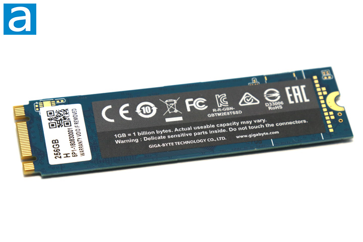 On the underside of the Gigabyte M.2 PCIe SSD 256GB, you will find no components to be interested in. A label directly on the back of the drive shows miscellaneous information, including all the certification and disposal information symbols. From the left label, you can see again we have the 256GB capacity printed here. One interesting thing I have noticed is the fact the Gigabyte labels on both sides reminds me of some of the Samsung M.2 drives, at least with its color scheme. Otherwise, there really is not much else to be interested in here.