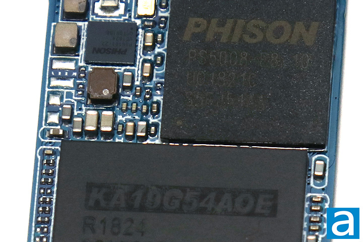 Peeling the top label back, we can see there are two major different components underneath. The first is a Phison PS5008-E8T. This controller is actually designed to be used without any onboard memory, and to mitigate the negative performance effects of such a design, the NVMe Host Memory Buffer feature was added. As such, we do not have any DRAM chips here. Otherwise, the PS5008-E8T is fabricated on the 40nm process, and is a dual-core chip with End-to-End Data Path Protection, StrongECC, SmartECC, SmartFlush, GuaranteedFlush, and Built-in Static and Dynamic Wear-Leveling support. According to Gigabyte, the rated power consumption is 0.05W idle, 2.2W read, and 2.1W write.